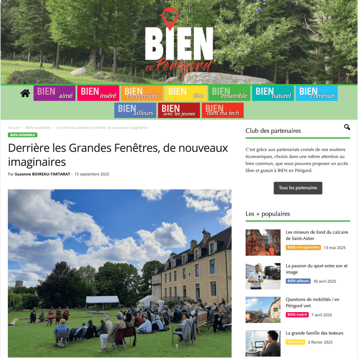 Vous trouverez ici les articles parus sur le travail des Grandes Fenêtres ou celui des artistes en résidence. Bien en Périgord | 15 septembre 2025 Derrière les Grandes Fenêtres, de nouveaux imaginaires France 3 Nouvelle-Aquitaine | 9 Juillet 2025 Culture : la deuxième vie de la villa des « Grandes Fenêtres » à Excideuil Dordogne Libre | 24 juin 2025 Les Grandes Fenêtres ouvertes sur la Palestine avec Shahd Alshamaly Dordogne Libre | 19 juin 2025 Les Grandes Fenêtres donnent de l’air à ses activités Sud Ouest | avril 2025 Une « maison hantée » devenue résidence européenne de création Sud Ouest | 16 mars 2025 « Les Mains vides » : après l’effondrement, la vie continue Dordogne Libre | 28 février 2025 Des résidences de création et des actions de médiation aux Grandes Fenêtres Sud Ouest Les Grandes Fenêtres rouvrent leurs portes avec une résidence artistique.